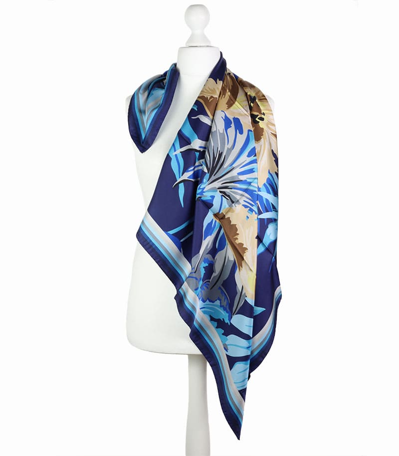 Apaszka damska jedwabna w kolorze niebieskim z kwiatowym wzorem.