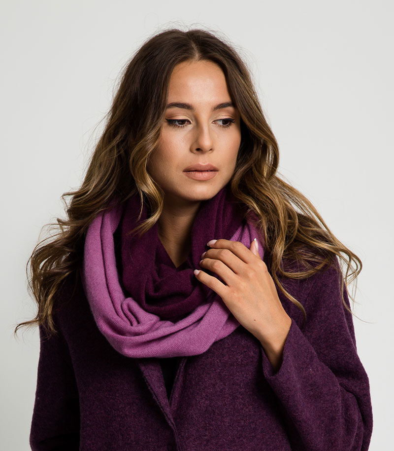 szal kaszmirowy w kolorze śliwkowym jest lekki, miękki, delikatny, daje przyjemne odczucie ciepła. Idealnie nadaje się jako dodatek do płaszcza w sezonie jesienno-zimowym. Będzie doskonałym wyborem dla Pań które preferują delikatną wełnę. Szale kaszmirowe z uwagi na właściwości hipoalergiczne polecamy dla osób uczulonych na owczą wełnę. Szal kaszmirowy dwukolorowy, komin, dwustronny. Doskonały wybór na elegancki prezent.