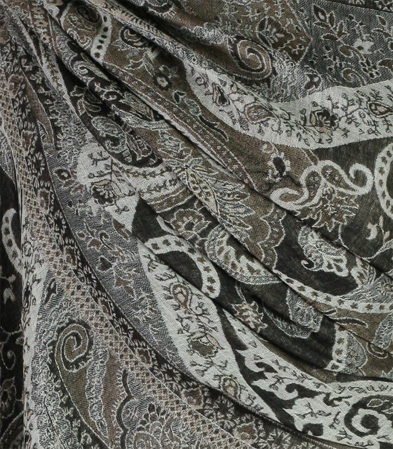 Szal welniany tkany w przepiękne motywy związane z kultura Indii, ciekawy wzór paisley, szal zakończony frędzlami.